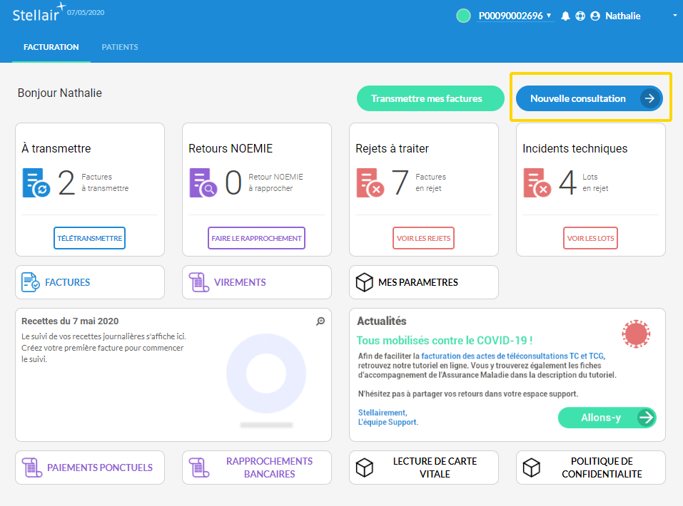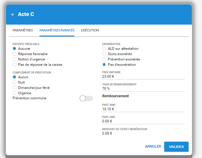 Il est possible d'ajouter un nouvel acte NGAP ou CCAM en appuyant sur la touche « Nouvel acte ». Cet acte devra ensuite être dûment configuré (date, taux de remboursement, montant etc.) avec les Paramètres et Paramètres avancés de l'acte.