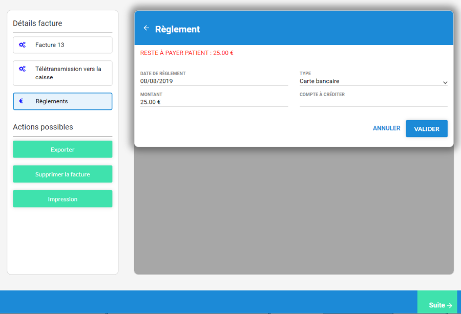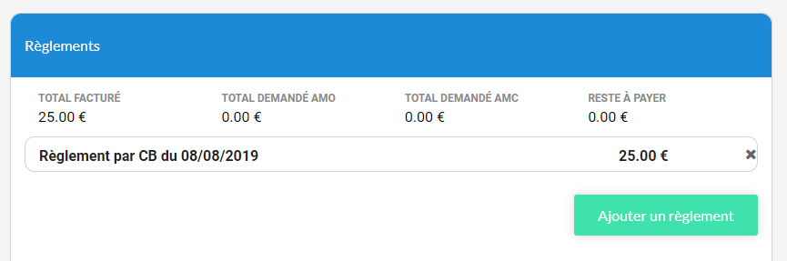 En cliquant sur « Ajouter un règlement », il est possible d'associer le paiement de votre patient (chapitre suivant).