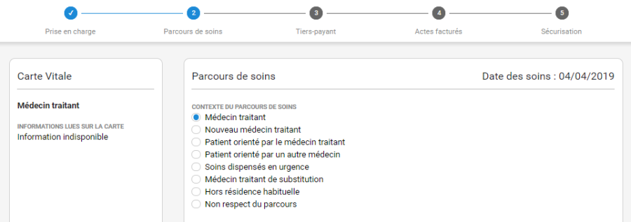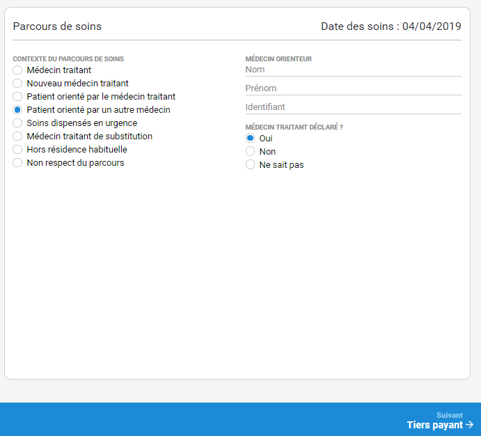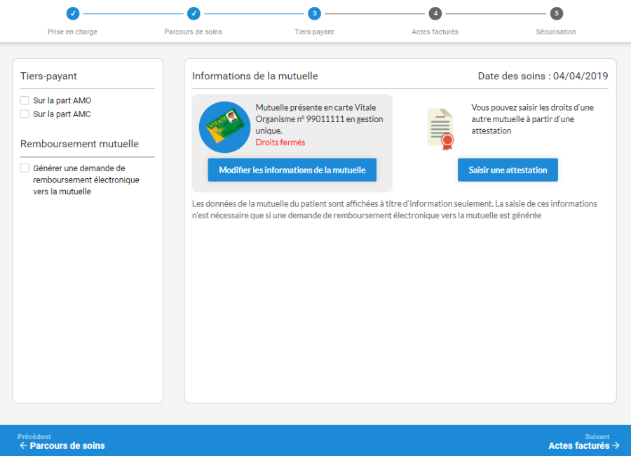 L'étape nommée Tiers-payant permet de déclarer le contexte de paiement.