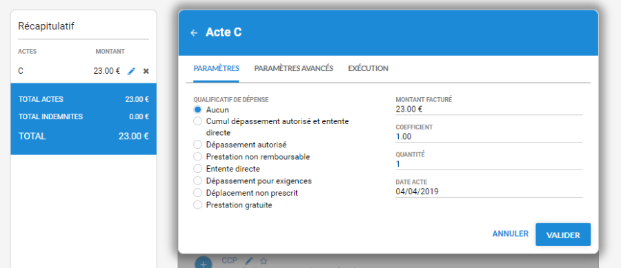 Il est possible de paramétrer un acte dans la liste, ou dans le récapitulatif une fois ajouté, en appuyant sur l'icône « » de l'acte.