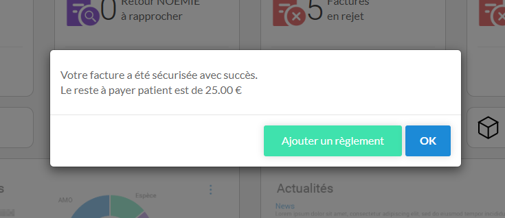 En cliquant sur « Ajouter un règlement », il est possible d'associer le paiement de votre patient à la FSE qui vient d'être signée.