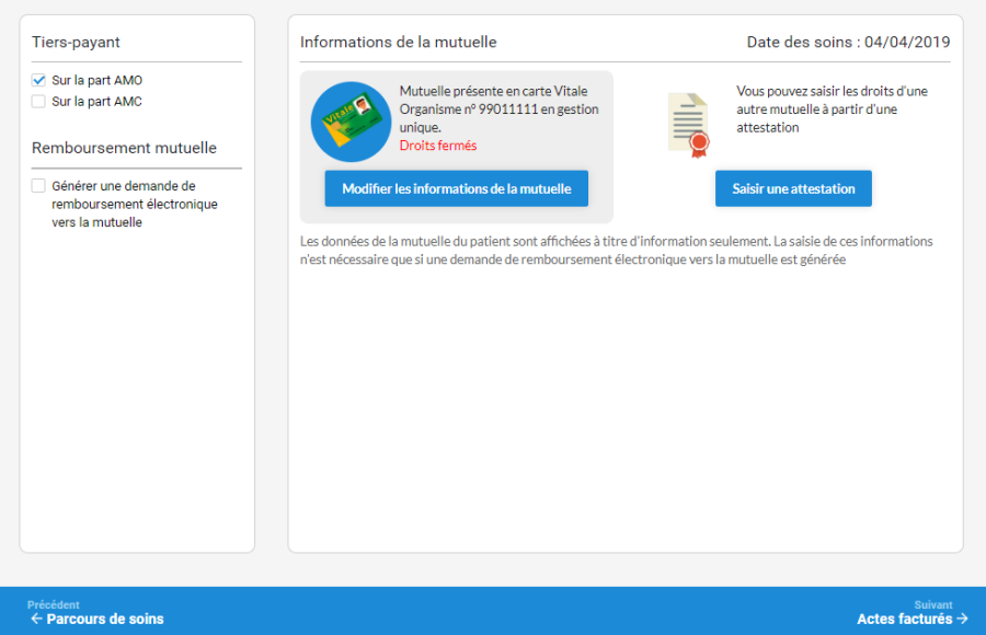 - Une mutuelle est enregistrée dans la carte Vitale et les droits sont ouverts,