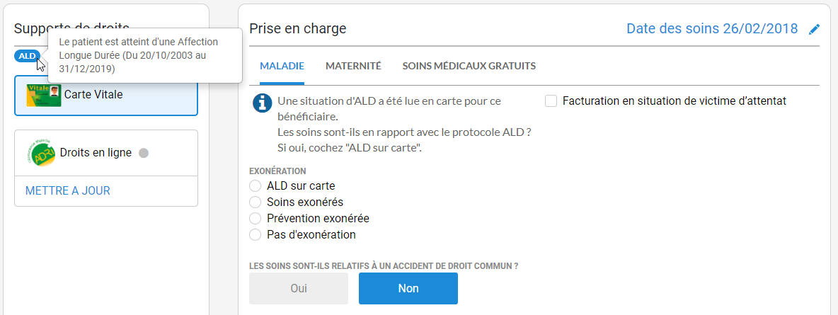 Dans ce cas, le patient a une ALD mais il n’a pas de situation d’exonération en carte.