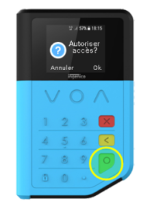 Le lecteur bippe et affiche la question ci-contre. Autorisez l'accès aux données de santé en appuyant sur la touche verte.