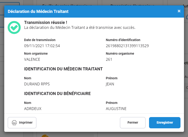 Un pop-up indique que la déclaration a été effectuée et permet d’Enregistrer ou d'Imprimer une accusée de réception.