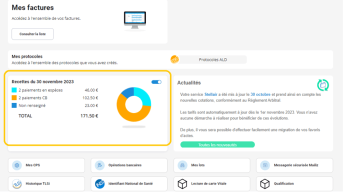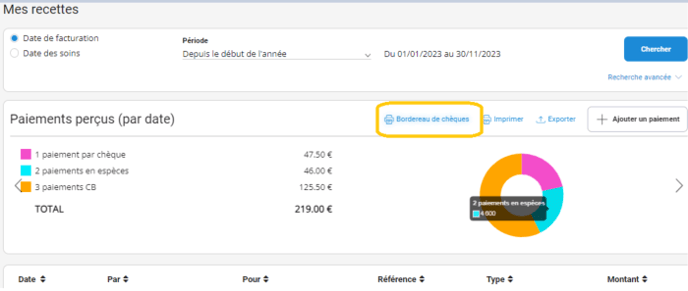 Le champ A encaisser vous permet de vérifier si une date d'encaissement a été enregistrée pour le chèque dans Stellair. Pour accéder à cette information, cliquez sur Recettes du jour.