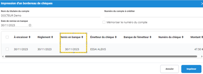Dans le menu Mes Recettes, depuis le lien Bordereau de chèques, la fonctionnalité d’impression des bordereaux comprend le nouveau champ Remis en banque. Il permet de visualiser si le chèque a déjà été remis en banque.