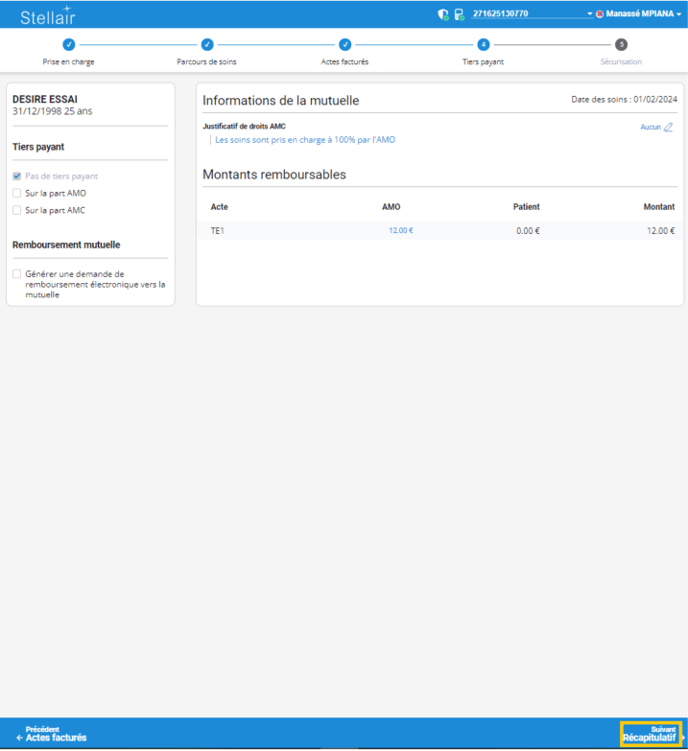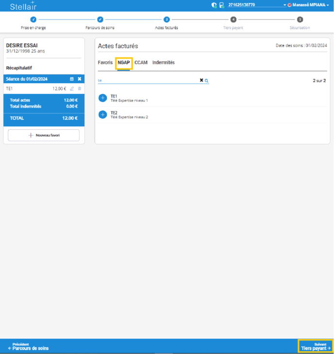 A l'étape Actes facturés sélectionner NGAP, par la suite ajouté les actes TE1 ou TE2 et cliquez sur suivant Tiers payants.