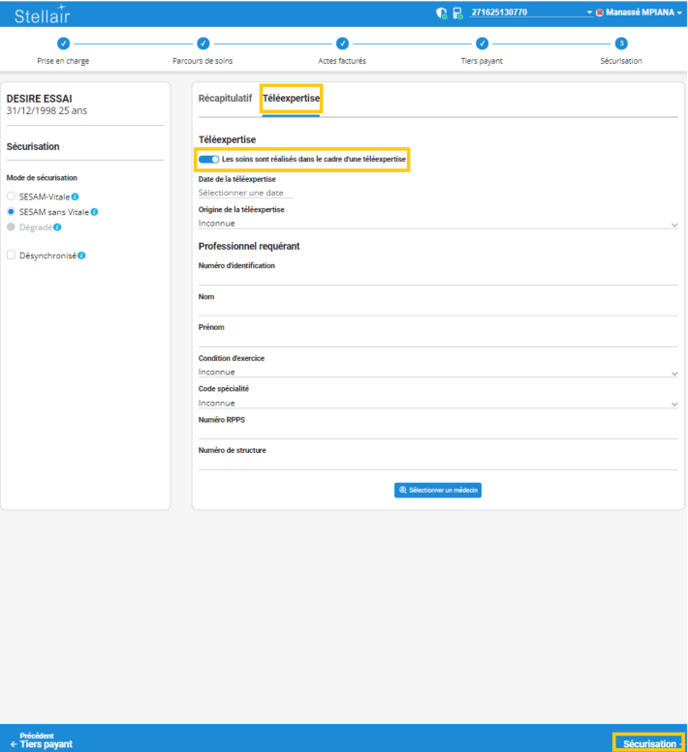 Il faut renseigner les tous les champs et cliquez sur Sécurisation pour enregistrer la feuille de soin.
