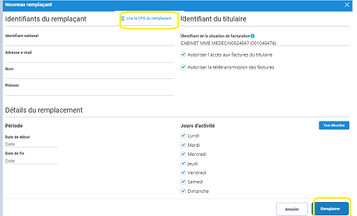 Si vous avez la carte CPS du remplaçant, l’insérer dans le slot utilisé normalement pour les cartes Vitale puis sélectionner "Lire la CPS du remplaçant".