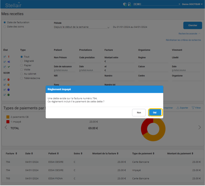 Une fois le montant de la facture renseigné et enregistré un popup s'ouvrir avec pour message : "une dette existe sur la facture numéro 794. Ce règlement inclut-il le paiement de cette dette ?"