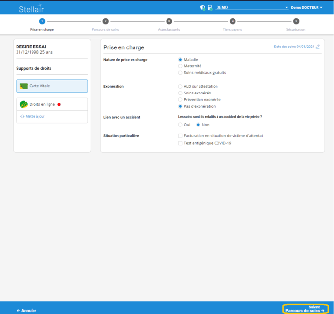Remplissez toutes les étapes de la feuille de soins en cliquant sur suivant après avoir fourni toutes les informations sur la situation du patient :