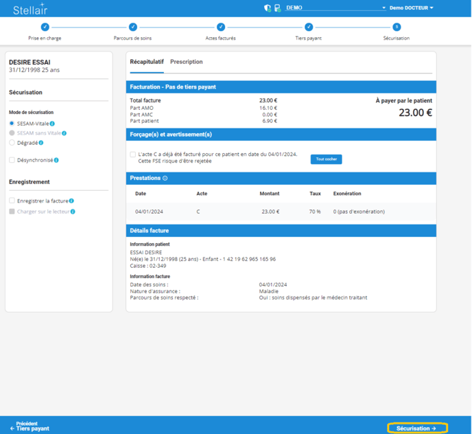 Une fois que vous avez rempli toutes les étapes de la feuille de soins, vous pouvez cliquer sur Sécurisation.