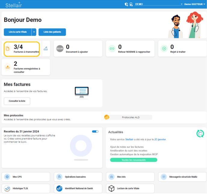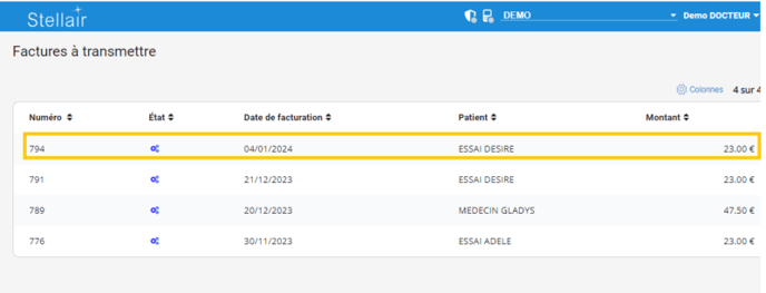 Cliquez sur l'option Facture à transmettre pour accéder à vos feuilles de soins.