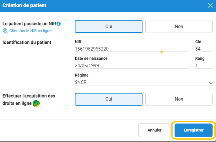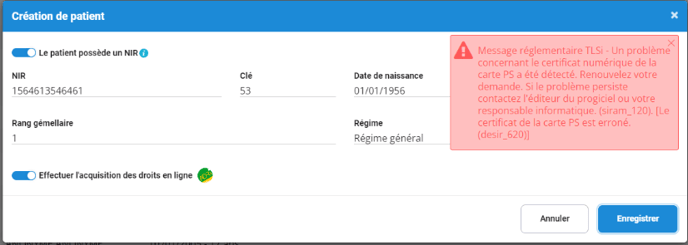 Vous avez renseigné les informations du patient et le message en rouge ci-dessous apparaît.