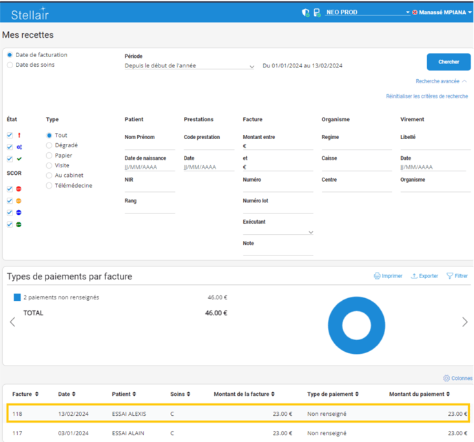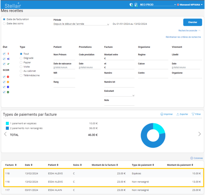 Stellair vous permet d'enregistrer deux paiements différents sur une même facture.