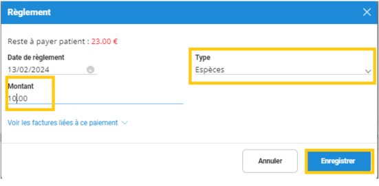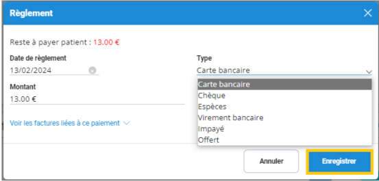 Dans un premier temps sectionner le Type de paiement et n'oubliez pas de modifier le montant avant de cliquez sur Enregistrer.
