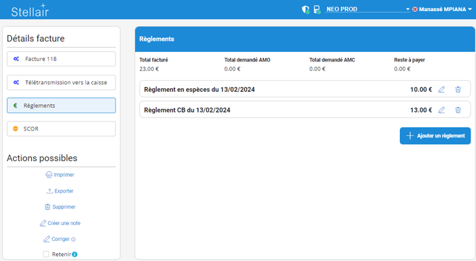 Dans la section Détails facture, cliquez sur Règlements pour voir les deux types de paiements enregistrés.